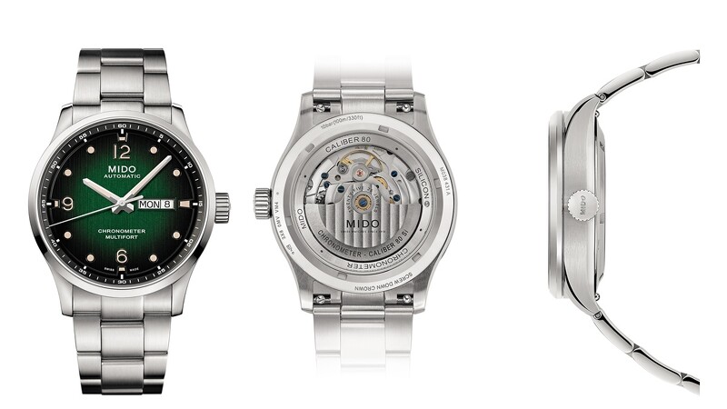 錶款技术资料:MIDO Caliber 80 Si 美度硅游丝天文台认证自动上鍊机芯(以ETA C07.821为基础),搭载硅游丝,摆轮夹板装饰有Si标誌,精雕细刻的机芯,自动盘装饰有日内瓦波纹和MIDO美度表标誌,蓝钢螺丝。5个方位调整其走时精确性。提供80小时动力储存。时、分、秒、日期、星期显示功能。丝光打磨不鏽钢錶壳及抛光处理錶圈,直径42mm,由3部分组成,双面防眩蓝宝石水晶玻璃镜面;旋入式錶冠,旋入式透明后底盖可观测其精雕细刻的机芯,刻有镌刻序号,防水深度100米。丝光打磨不鏽钢錶带和折叠錶扣,3节式,扣环刻有MIDO标誌。配以快拆装置,便于自行更换錶带 (无需工具)。丝光打磨黑绿渐变双色直条纹錶盘 (黑色外围至中央绿色);边缘刻有60分钟刻度;位于6、9、12点钟位置的数字以及其他位置圆点时标刻度,经Super-LumiNova®米色夜光涂层处理(绿色夜光显示),确保夜间能清晰读取时间。双面切割时针和分针,经米色Super-LumiNova®夜光涂层处理 (绿色夜光显示);平面钻石切割秒针。NT$42,400